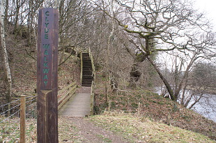 Keep to riverbank, crossing the bridge over Jock's Burn. Keep left and follow the route as it undulates until reaching a kissing gate and cross ahead and continue following official markers (picture above ****). Take steps back to the river, turn left and follow the riverbank until taking another flight of steps. Passing Waygateshaw House on the left. Following river to Crossford Bridge. Cross road and re-enter route to Left of pillar. (picture below)