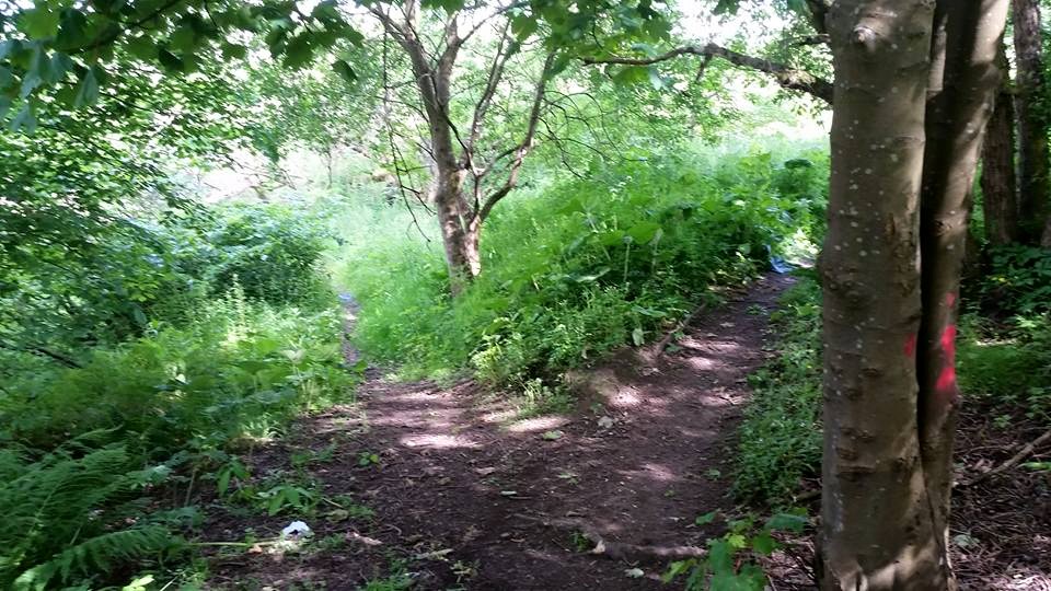 Keep ahead until a path with some old brick paving is met; turn Left and descend to reach the Miners Footbridge crossing the Rotten Calder. (trees have marker ribbons, keep an eye out for them)