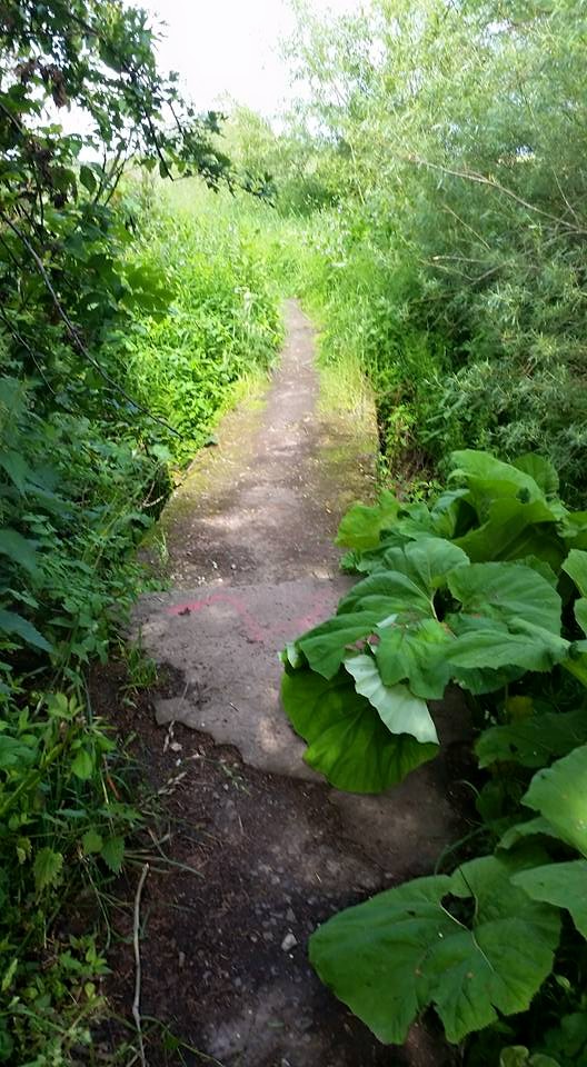 A fallen tree blocks the main path, follow diversion shown in pictures. On picking up normal route keeping rthe iver to lyour eft and pylons to your right until you reach the two arched steel bridges.