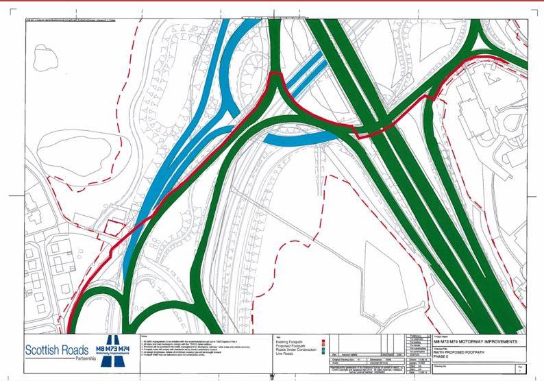 Raith diversion. Cross Bothwell Bridge. At mini rbt cross and follow with direction of traffic in line with dual carriageway. Keep to footpath to left of dual carriageway. Follow path to Raith and cross at pedestrian lights. This will all be well signed on race day.